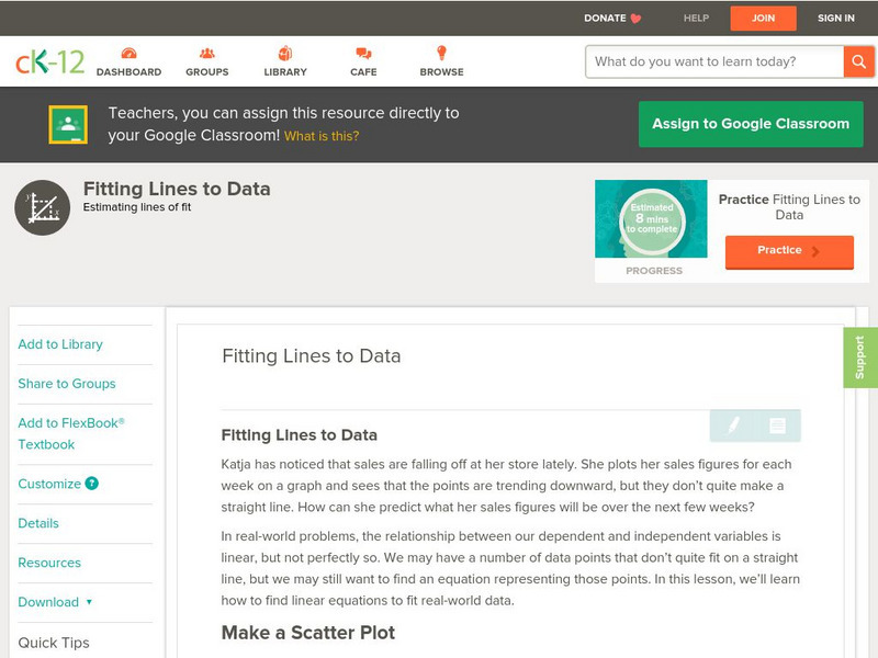 [Free Registration/Login may be required to access all resource tools.] Make a scatter plot of data and find the line of best fit to represent that data.