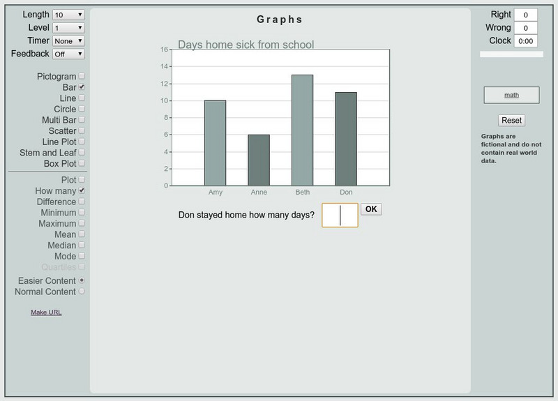 This site provides students practice with the concept of line graphs. Students can learn about the topic by completing an interactive tutorial. Students can then take a ten question timed test to practice the skill.