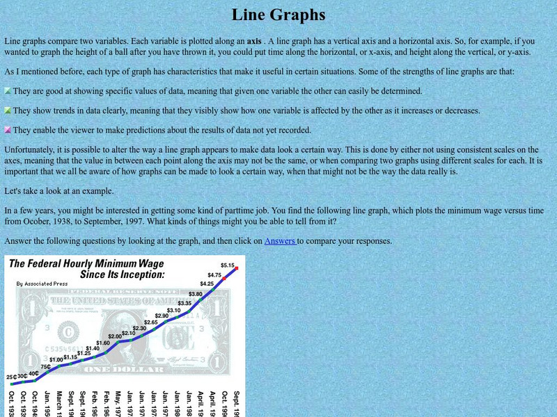 This site is a lesson on creating and interpreting a line graph. It explains how a line graph is created and then asks questions about what is learned from the data. Students type in open responses, and answers and feedback follow.