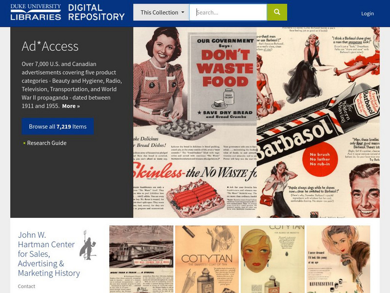 Images and database information for more than 7,000 ads printed in U.S. and Canadian newspapers and magazines between 1911 and 1955. Five main subject areas: Radio, Television, Transportation, Beauty and Hygiene, and World War II.