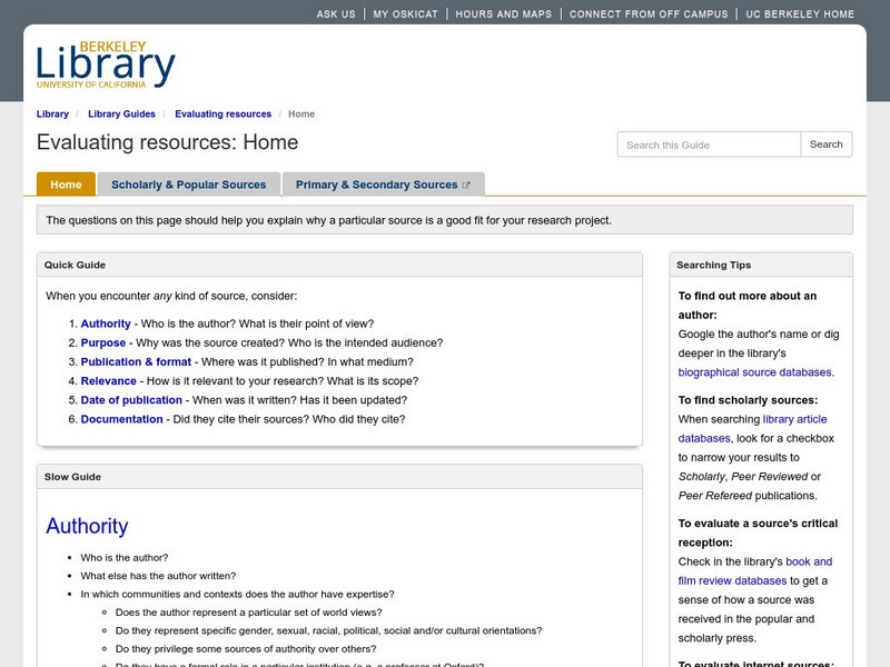 Questions to ask yourself when determining if a source is reliable. Discusses difference between primary and secondary source. List of reference sources and links to other sites that teach you how to evaluate sources....