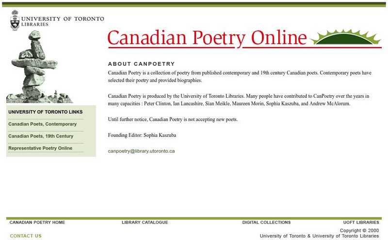 A comprehensive resource for many issues and examples of poetry from Canada. Includes a section on Canadian poets, journals and magazines, literary events, and more. Very detailed and informative.