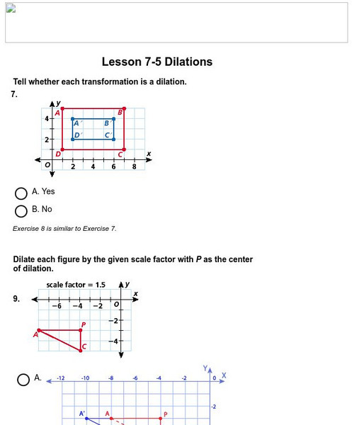 Get independent practice working with dilations. Each incorrect response gets a text box explanation and another try. Correct responses are confirmed.