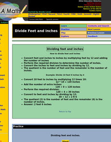 This site reviews the process of converting feet to inches and inches to feet using multiplication or division. Students can practice the skills through self-check exercises and timed learning games.