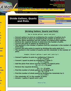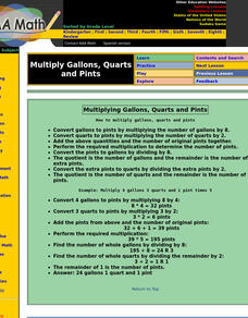 This site reviews the process of converting gallons, quarts, and pints using multiplication or division. Students can practice the skills through self-check exercises and timed learning games.