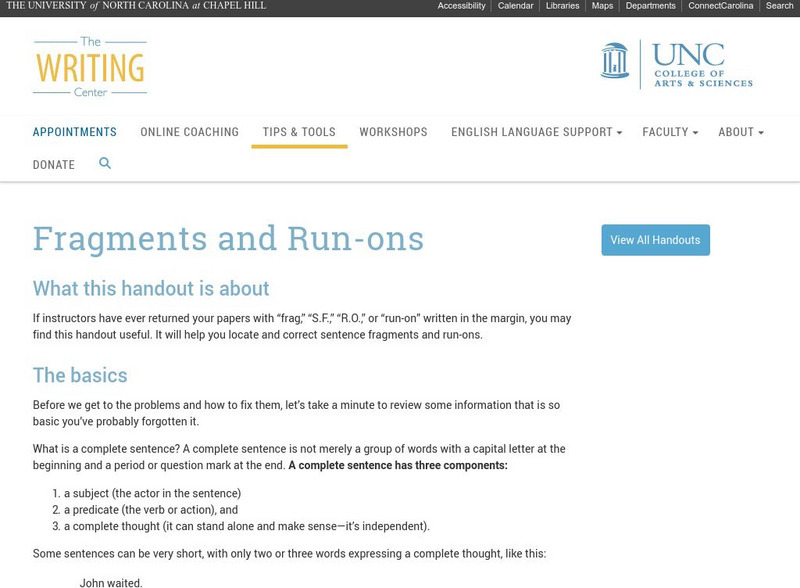 University of North Carolina: Writing Center: Fragments and Run Ons