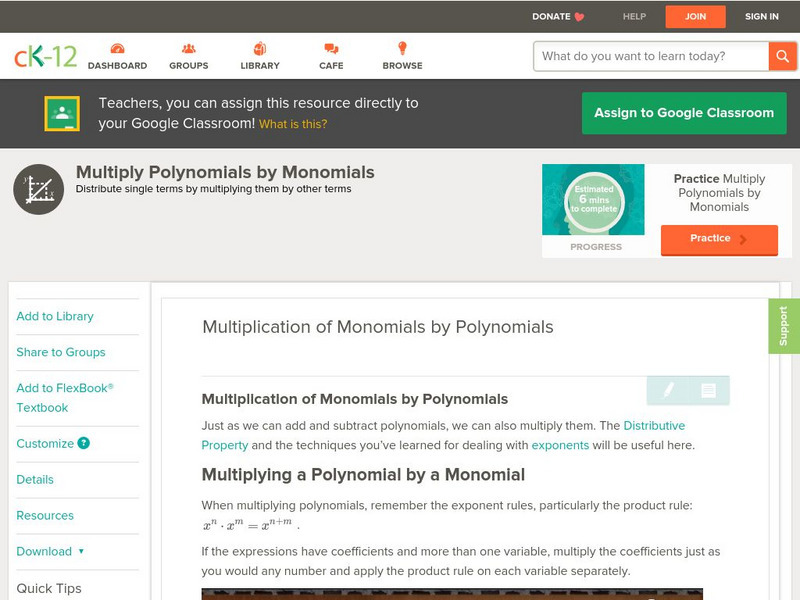 Ck 12: Algebra: Multiplication of Monomials by Polynomials