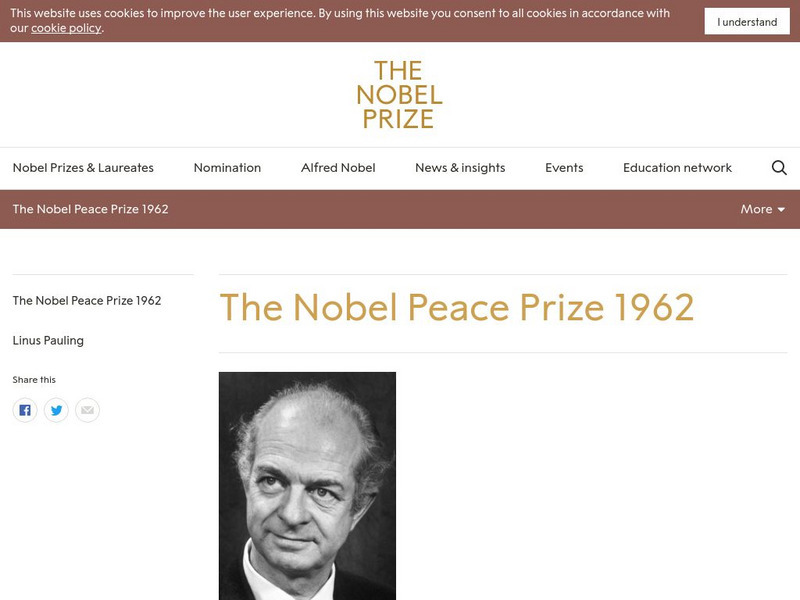 Read about Linus Carl Pauling, the winner of the 1962 Nobel Peace Prize. This website is organized into the following sections: "Presentation Speech," "Biography," "Nobel Lecture," "Other Resources," and "The Nobel Chemistry Prize 1954."