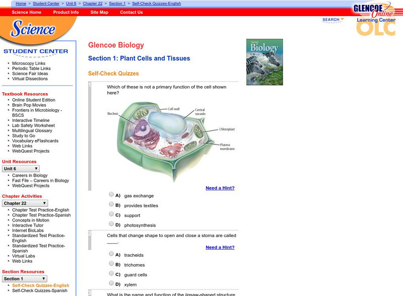 Glencoe Biology: Plant Cells and Tissues: Self Check Quizzes