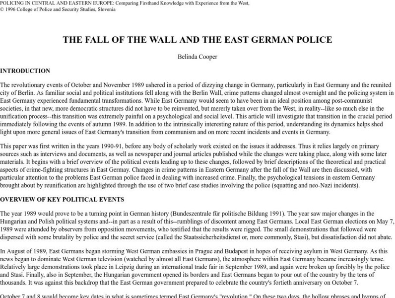 This site evaluates the crucial period immediately following the fall of the Berlin Wall in the autumn of 1989. It examines the wall's effects on law enforcement and the role of the East German Police.