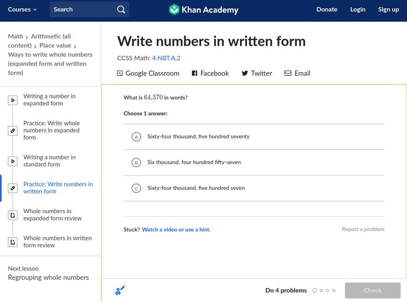 Practice working with whole numbers in written form. For example, "one thousand four hundred three" is the written form of 1403. Students receive immediate feedback and have the opportunity to try questions repeatedly, watch a video or...