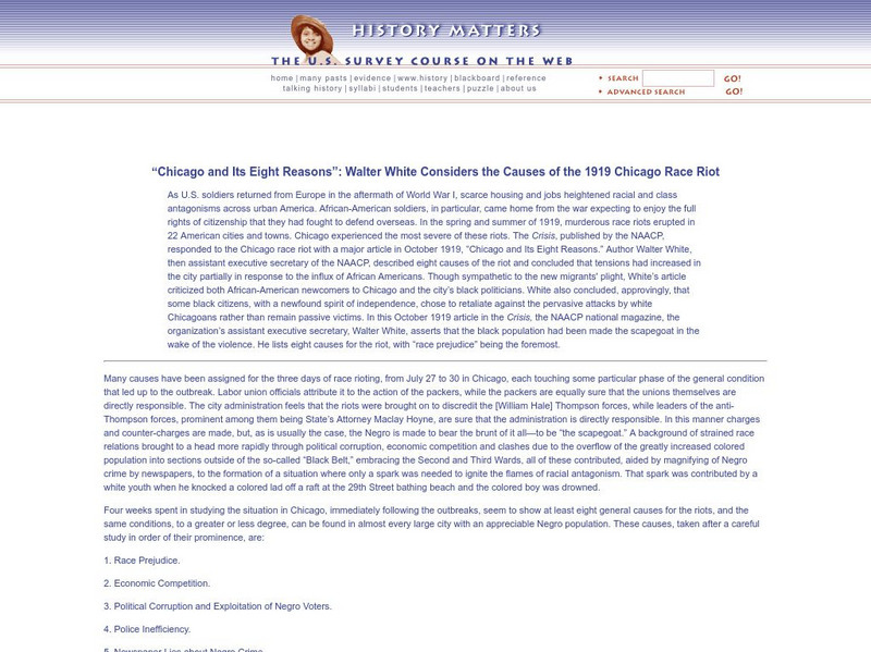 An article by NAACP executive secretary, Walter White, discusses the eight reasons he saw for the Chicago Race Riots in July, 1919. He goes into great detail to support these causes.