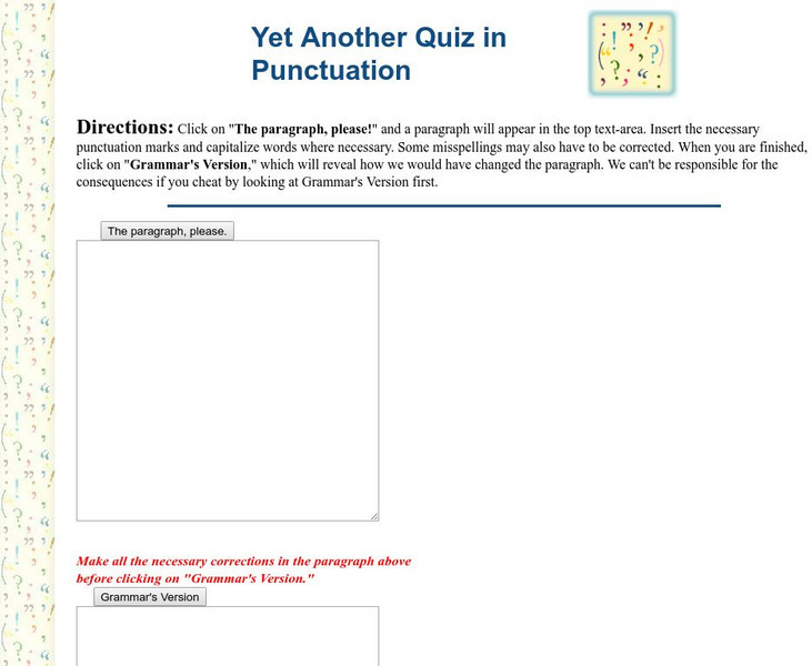 In this interactive grammar quiz, students are asked to read a paragraph and insert the correct punctuation, capitalization, and corrected spellings. When finished, they click on "Grammar's Version" for the corrected paragraph with...