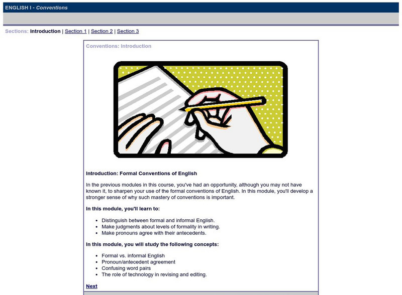 Sharpen your use of the formal conventions of English with this self-guided learning module. The module focuses on formal and informal language, making pronouns agree with their antecedents, and common spelling and grammar errors. At the...