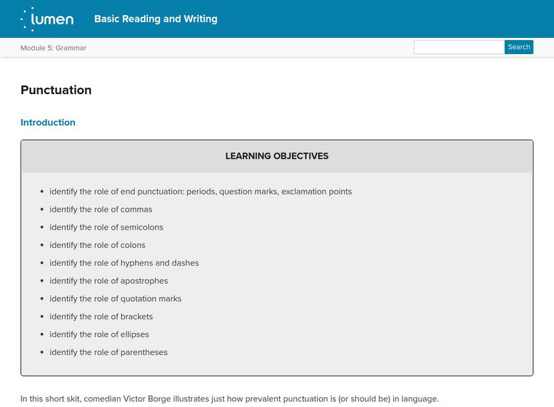 A learning module that teaches students about the rules of punctuation in six mini-lessons: Introduction, Terminal Punctuation, The Common Comma, Apostrophes and Quotation Marks, Semicolons, and Your Turn.