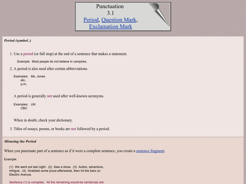 Resourceful site which includes information about periods, question marks, and exclamation marks. Also provides examples and addresses abbreviation rules for periods.