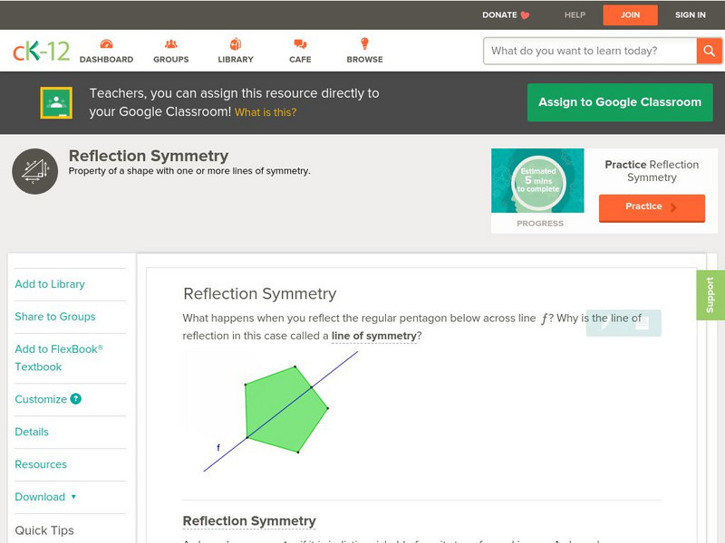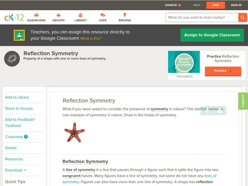 [Free Registration/Login may be required to access all resource tools.] This concept teaches students how to determine whether or not a shape has reflection symmetry and how to draw lines of symmetry.