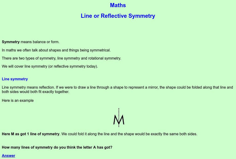This website will provide you with a quick review of line or reflective symmetry. It also has questions and answers to help you understand line/reflective symmetry.