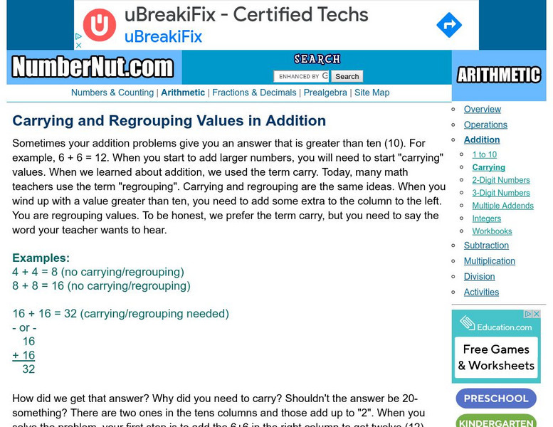 Explains how to carry when regrouping in addition, with related activities for skill practice.