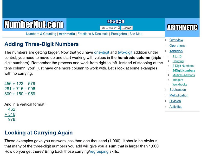 This website helps you go through the steps to add larger numbers when you need to "carry." There are audio instructions that show you step-by-step how to do the traditional algorithm. Requires Java.