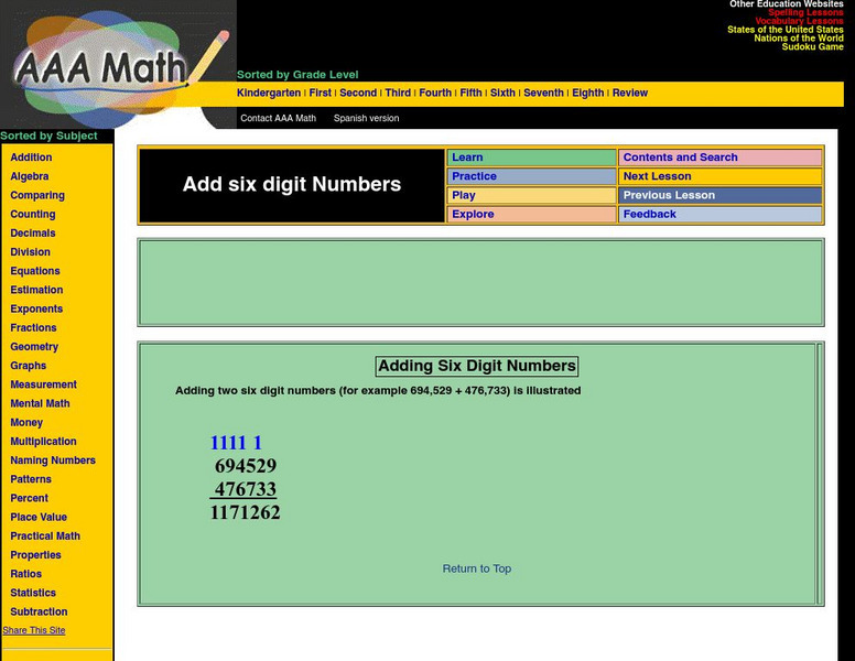 This lesson has a game and explanation of addition with six digit numbers. The game will keep running totals of your correct and incorrect answers. It will also give a percent score of the correct answers for you to see.