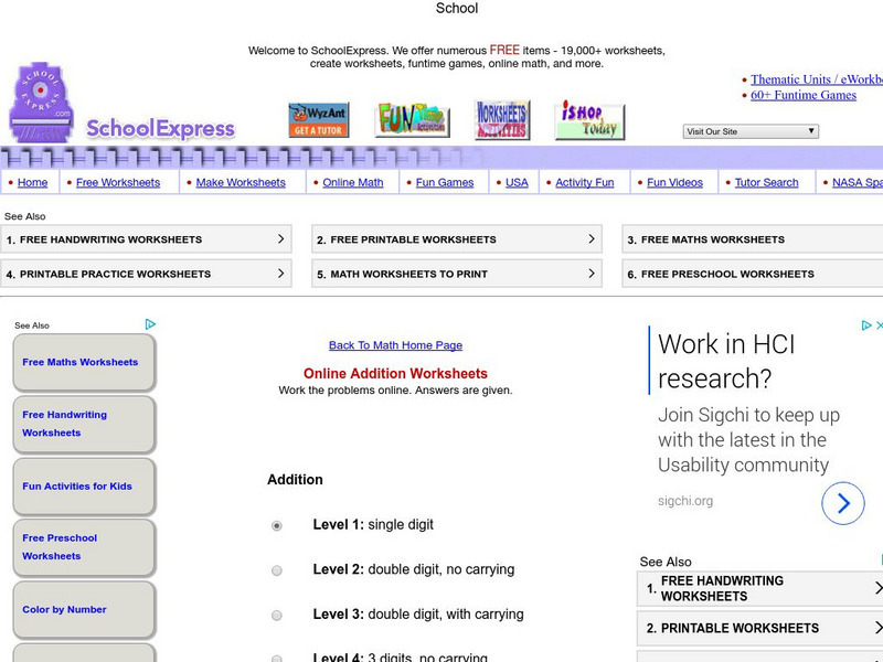 Great place to sharpen your addition skills. Start with basic facts and go all the way up to 3 digit addition with regrouping. You select the level of difficulty and the number of problems. You can also check your answer right away.