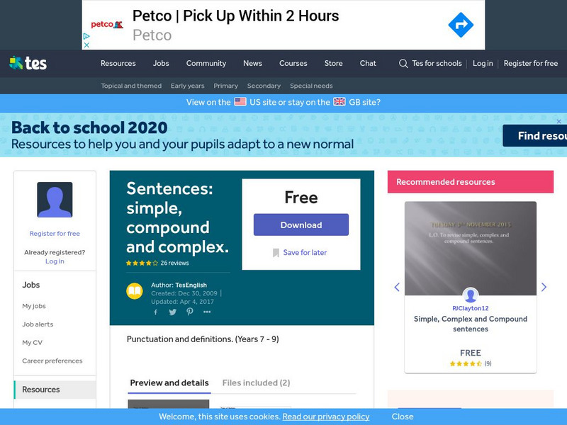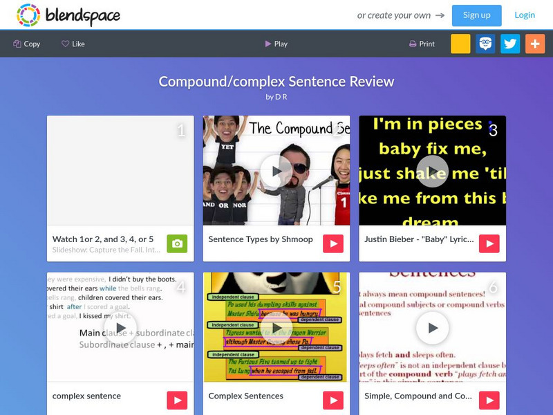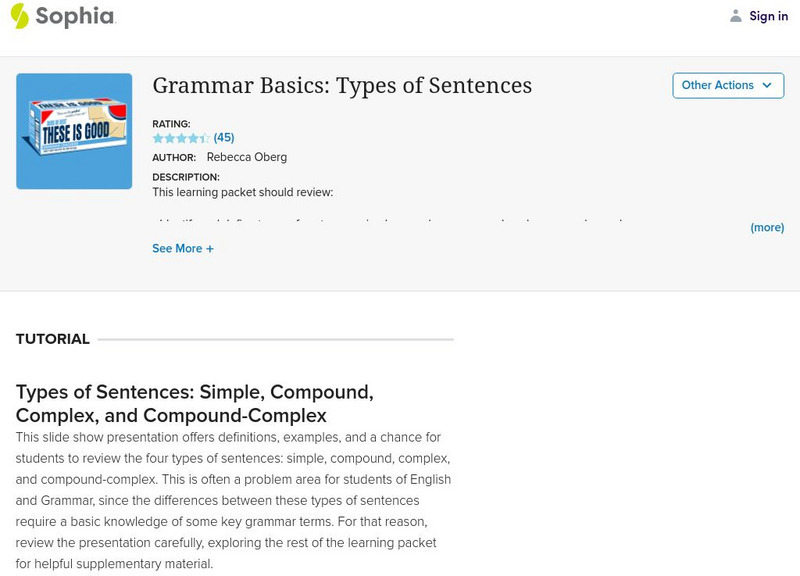 This site provides multiple resources on the different types of sentences. Students can observe a presentation on simple, compound, and complex sentences, watch a video [4:19] about simple sentences, and link to a video about compound...