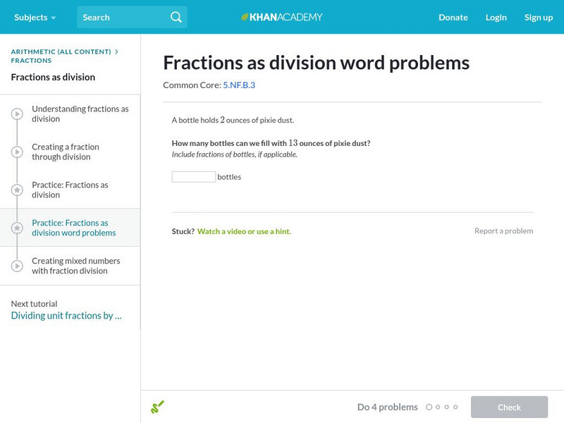 Practice word problems that involve using the fraction bar as division. Students receive immediate feedback and have the opportunity to try questions repeatedly, watch a video or receive hints.