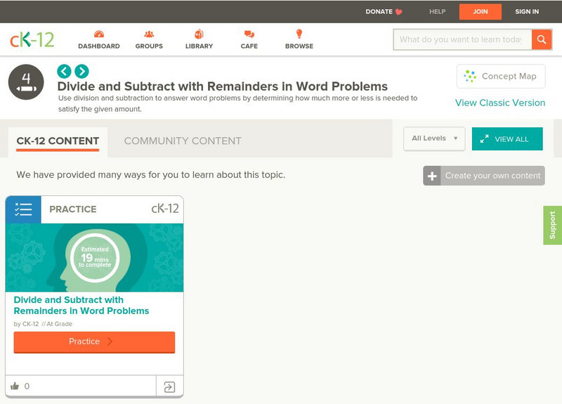 [Free Registration/Login may be required to access all resource tools.] For this learning module, students must solve word problems using division where there is a remainder. Includes video demonstrating a sample problem [1:56] and a set...