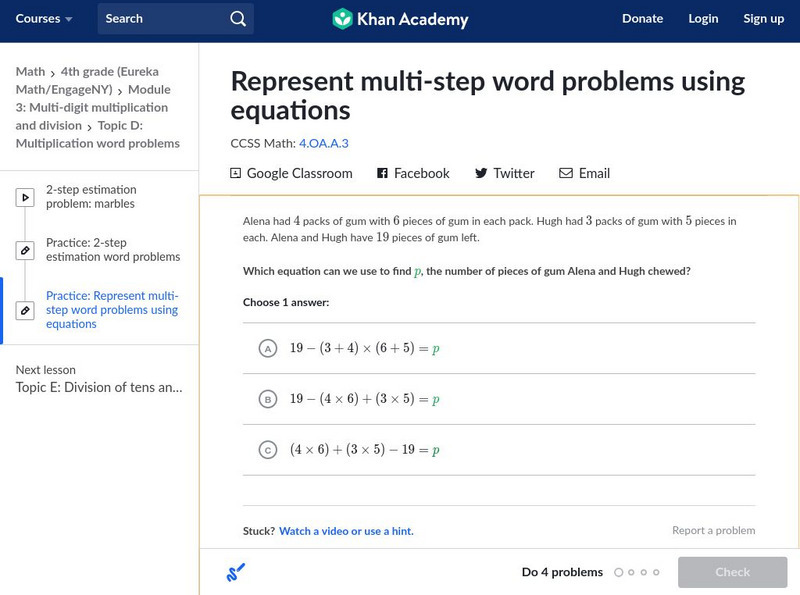 Khan Academy: Represent Multi Step Word Problems Using Equations