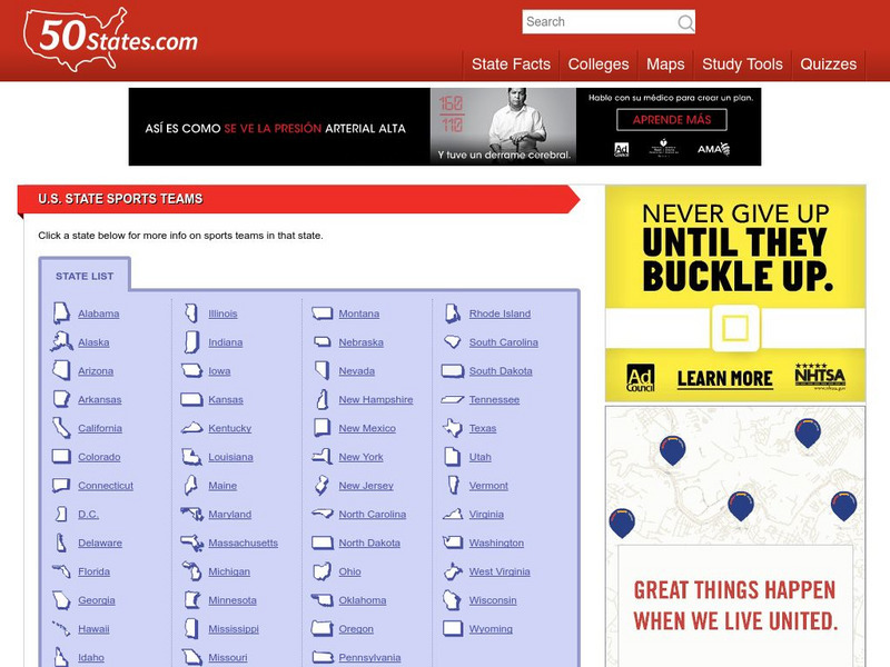 All fifty states are linked here to lists of sports teams, organizations, and venues for each of them. Each item is linked to a web page. (Some links may need updating.)