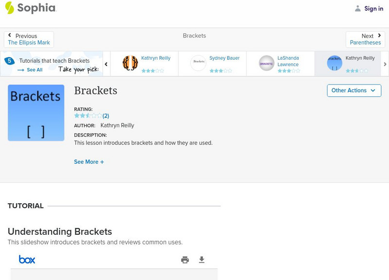 This slideshow lesson focuses on brackets by providing background information and uses including the following: clarify details, adding emphasis, modifying quoted material, and marking errors in quotations using [sic]. It provides...