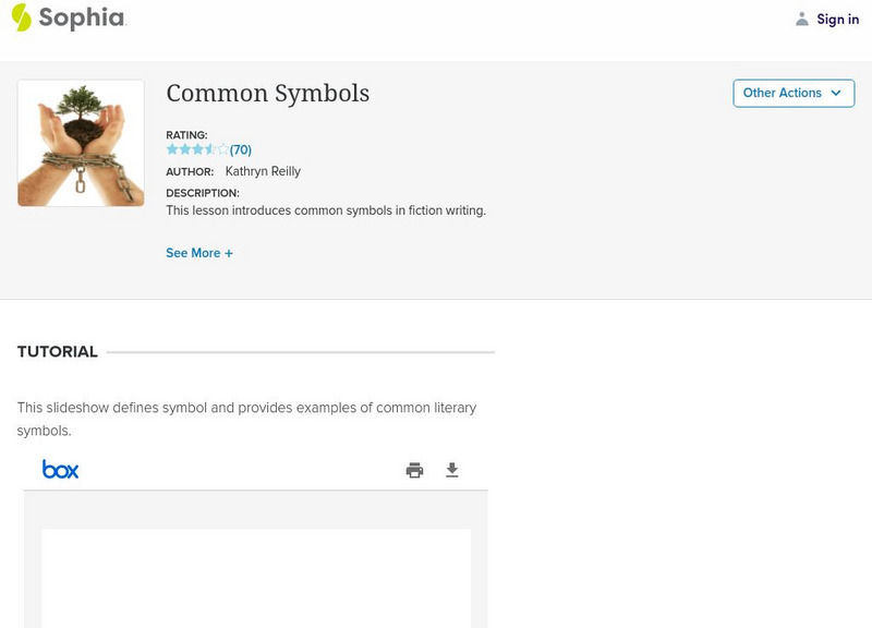 This slideshow focuses on common symbols including definition and background information, identification, and lists of common symbols and their meanings by category: colors, flowers, animals, seasons, elements, religious, weather,...