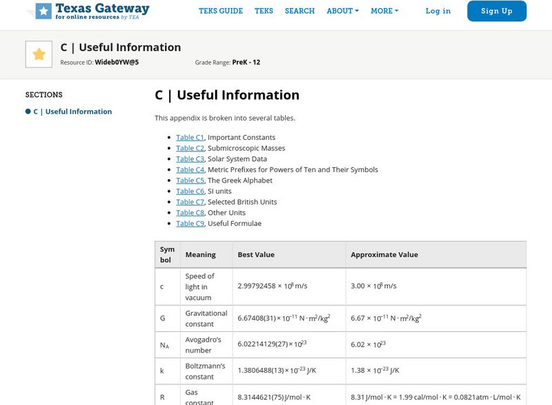 This page provides eight tables of useful information such as Important Constants, Submicroscopic Masses, Solar System Data, Metric Prefixes for Powers of Ten and Their Symbols, The Greek Alphabet, SI units, Useful Formulae, and other...