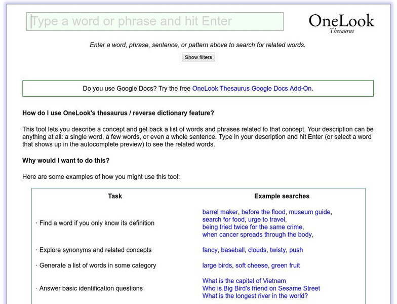 OneLook is a dictionary for those times when you have a good idea what a word means, but you can't think of the word itself. You can also generate lists of related terms or possible answers for crossword clues. L.9-10.4c References,...