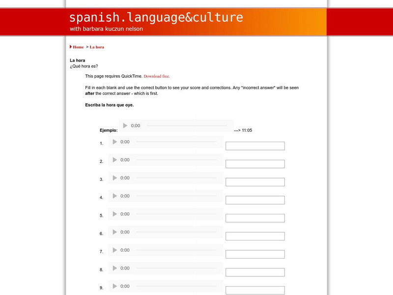 Listen to each time given in Spanish and type in (numerically) the time that you hear. Great practice for telling time in Spanish. At the end of the exercise the student can compare his responses with the correct answers.
