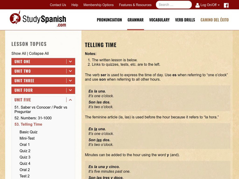 An online resource tool to help students understand how to tell time in Spanish. Numerous examples are given to aid in learning. Brief quizzes are given at the end of the lesson to test what you've learned. Bilingual.