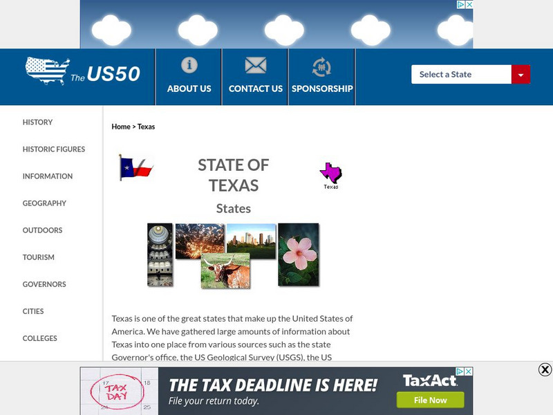 Offers much general information regarding Texas history, famous people, cities, geography, state parks, tourism, and historic sites. A fact sheet of information and a quiz are also available.