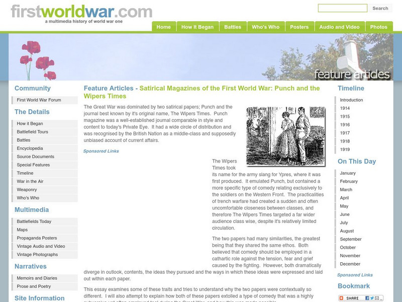 Read about the "Humor," magazines of the Great War and their role in the conflict. The site includes illustrations from the publications and views of various scholars about them. A bibliography follows the article. Site by First World...