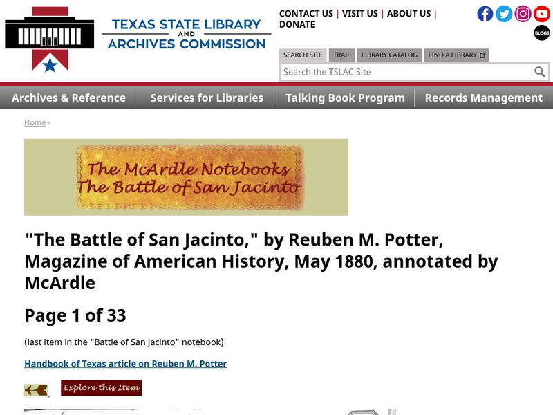 Texas State Library and Archives Commission: Battle of San Jacinto: Reuben M. Potter, Magazine of American History
