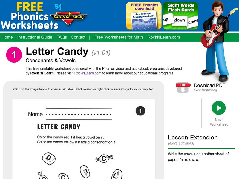 This printable worksheet from Rock 'N Learn can be used as a reinforcement activity or as an assessment. Students will distinguish vowel letters from consonant letters. An answer key and lesson extension are included.