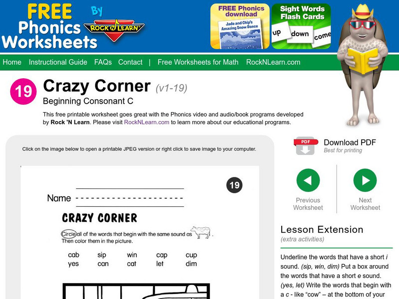 This printable consonant letter worksheet from Rock 'N Learn can be used as a reinforcement activity or as an assessment. Students will look at a picture with multiple items and then identify each item that start with /c/. An answer key...