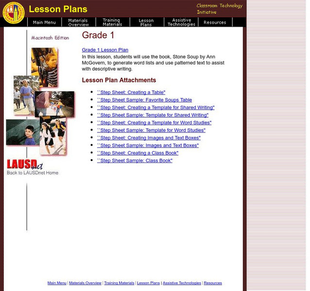 In this lesson, students use Stone Soup by Ann McGovern to generate word lists and use patterned text to assist with descriptive writing. Gives links to step sheets and samples for creating a table , a template for shared writing, a...