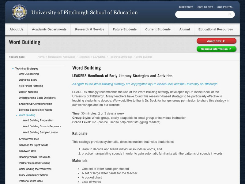 This instructional activity walks teachers through a strategy for teaching word building skills to early elementary students. The site includes links to a page on preparing the materials needed for word building lessons, and to a page...