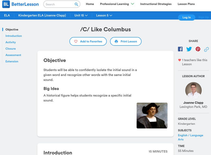 A historical figure helps students recognize a specific initial sound, the hard /c/.