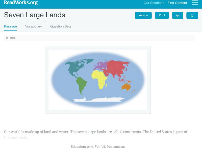 [Free Registration/Login Required] An informational text introducing the seven continents. A question sheet is available to help students build skills in reading comprehension.
