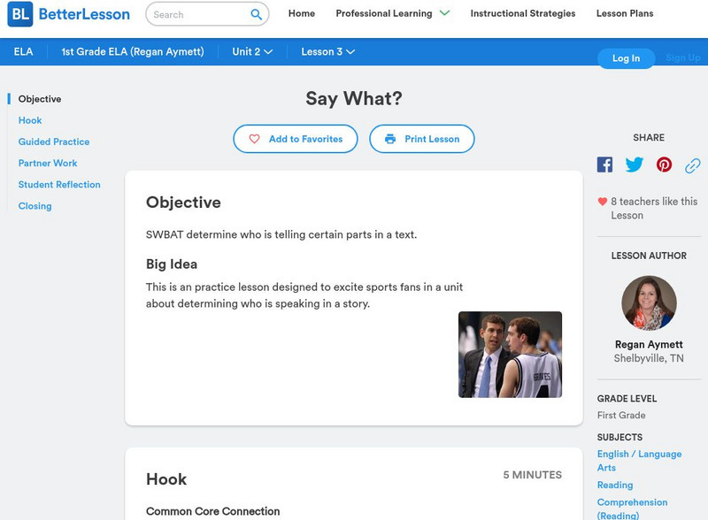 This is a practice lesson designed to excite sports fans in a unit about determining who is speaking in a story. The students practice this specific skill as the teacher models it in the hook. They get guided practice sorting and...