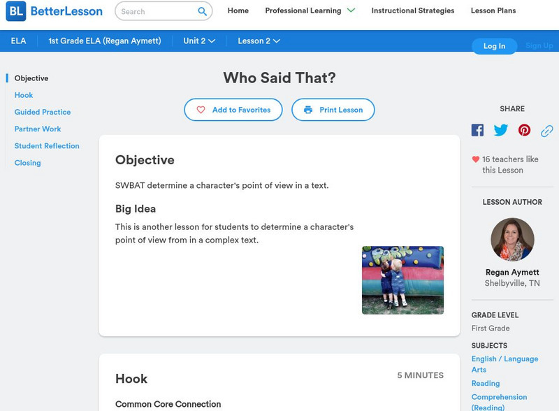 It is important for students to learn how to identify who is telling the story. This lesson not only asks students to identify the speaker but also asks the students to start identifying the point of view in the guided practice and...