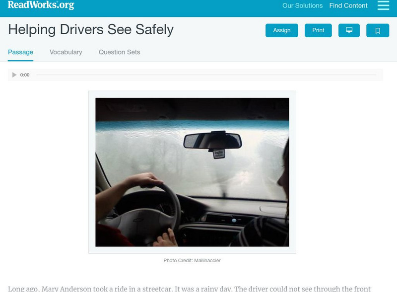 [Free Registration/Login Required] An informational text about the invention of windshield wipers. A question sheet is available to help students build skills in reading comprehension.