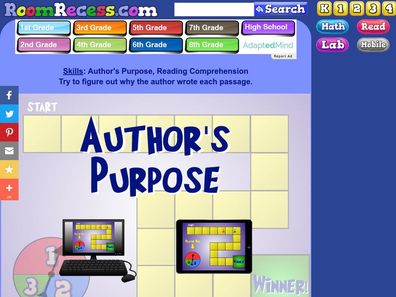 Read short texts and determine whether their purpose is to inform, entertain, or persuade in order to move around the board in this online learning game. Click on video lessons for an understanding of author's purposes including types of...
